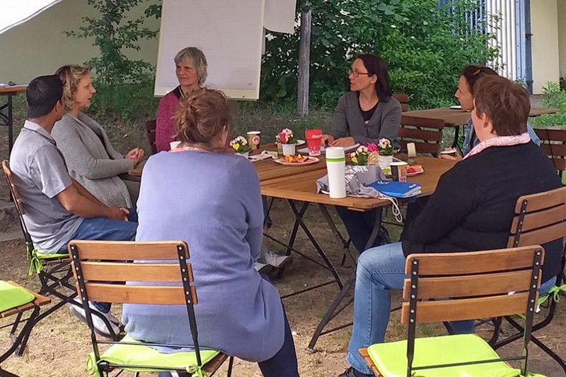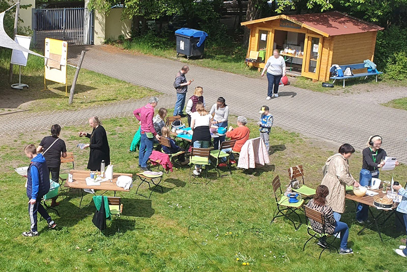 Am Anfang fand das Elterncafé nur einmal im Monat statt. Als Überdachung hatten wir ein Sonnensegel und es gab auch schon das Gelände. Wir haben unseren Platz zunächst weiter eingerichtet, gemeinsam mit den Eltern ein Gartenhaus gebaut und dort eine Küche installiert. Dann kam Corona. Damit wir den Kontakt zu den Eltern aufrechterhalten konnten, kam ein digitales Café hinzu. Dieses gibt es nun immer noch in den kalten Monaten, wenn wir nicht draußen sein können. Eltern erhalten darüber Weiterbildung und eine Möglichkeit zum Austausch.